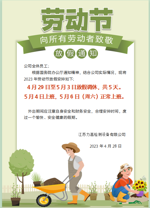 江蘇力高檢測設備有限公司五一勞動節放假通知
