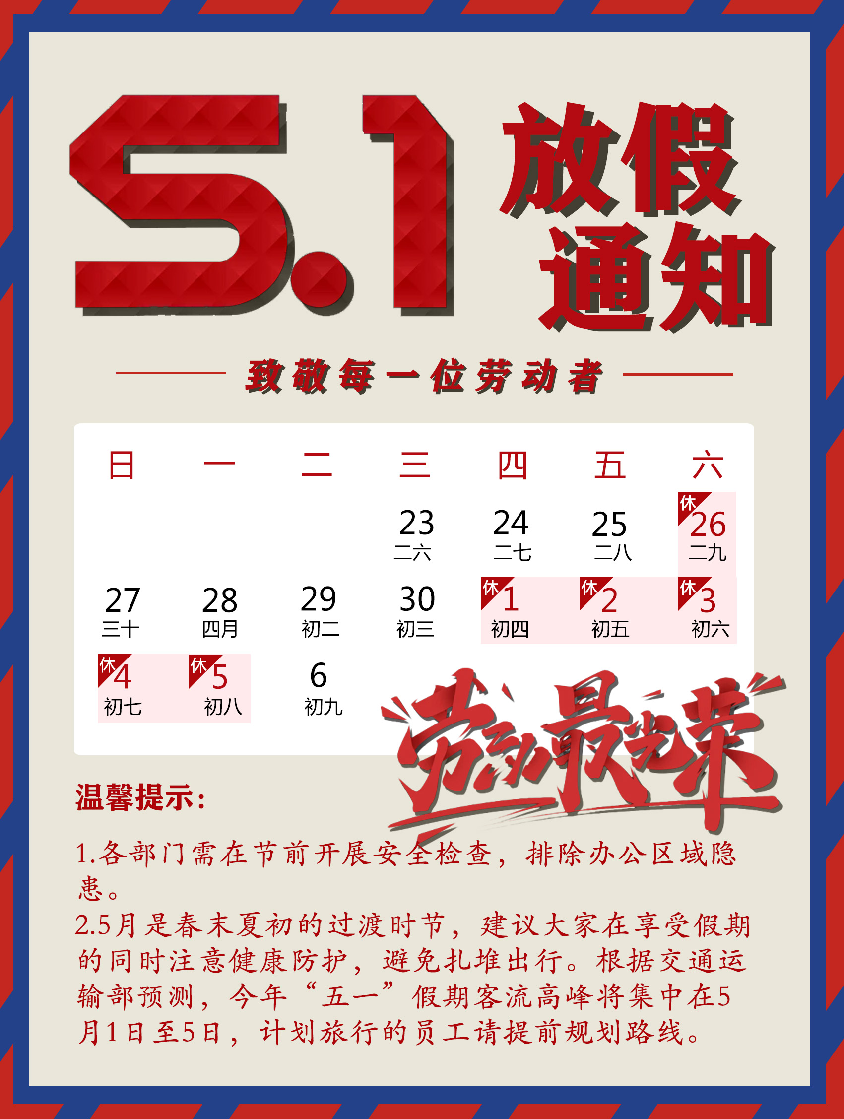 時(shí)值春意未盡、夏韻初臨的五月,我們即將迎來2025年“五一”國(guó)際勞動(dòng)節(jié)。根據(jù)國(guó)務(wù)院辦公廳及公司統(tǒng)一部署,現(xiàn)將2025年五一假期安排公告如下: