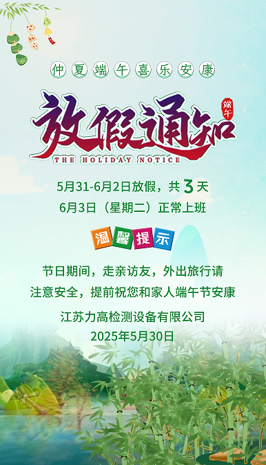 根據國務院辦公廳《關于2025年部分節假日安排的通知》精神,2025年端午節假期定為5月31日(周六)至6月2日(周一),共3天。本次放假無需調休,為企業員工與客戶提供了連貫的休息時間。值此傳統佳節之際,江蘇力高謹向全體員工及合作伙伴致以節日問候,并同步安排假期相關事項,確保業務銜接與客戶服務不受影響。