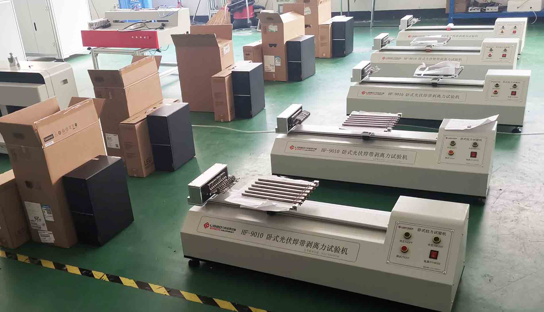 在光伏行業占首要地方,與通威,隆基樂葉,中來等企業期合作,產品得到客戶的高度認可,下圖為江蘇某光伏廠家一次性訂購五臺十二工位光伏焊帶拉力試驗機。